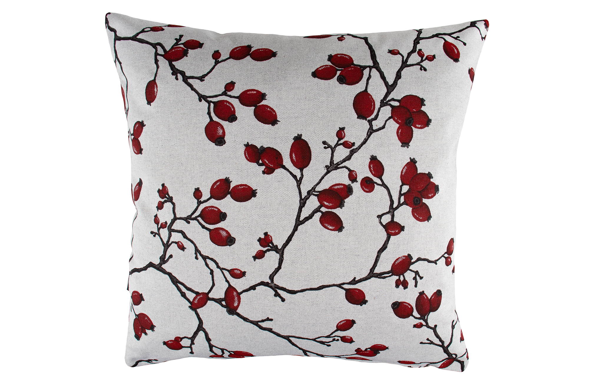 Kaunis jouluinen Ruusunmarja koristetyyny 45x45cm. Irroitettava polyesterinen sisätyyny, päällinen avattavissa vetoketjulla. Pesu 30 asteessa.