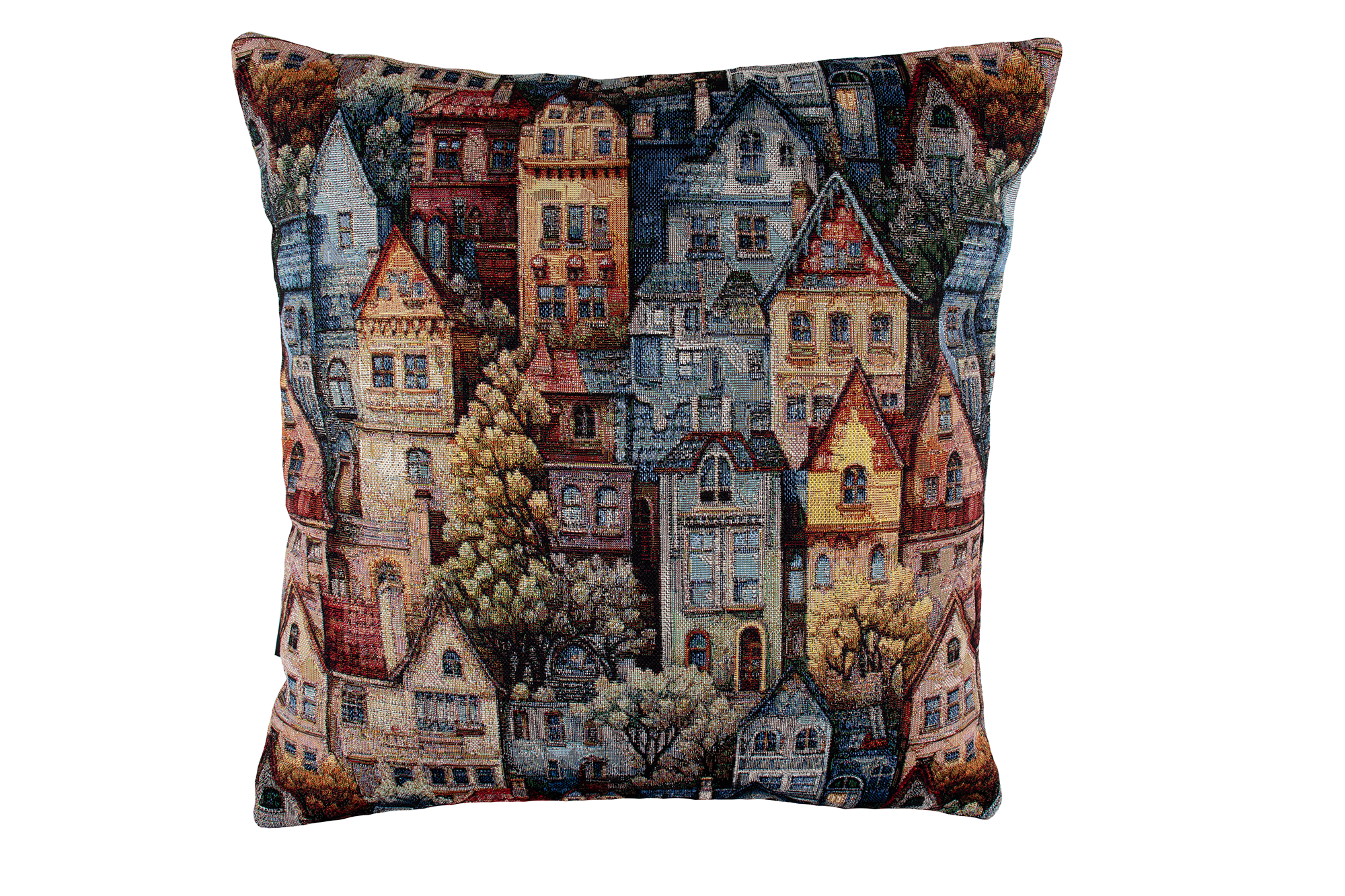 Upea gobeliinikankaasta valmistettu koristetyyny Satumaiset talot 45x45cm. Irroitettava polyesterinen sisätyyny, päällinen avattavissa vetoketjulla. Pesu 30 asteessa.