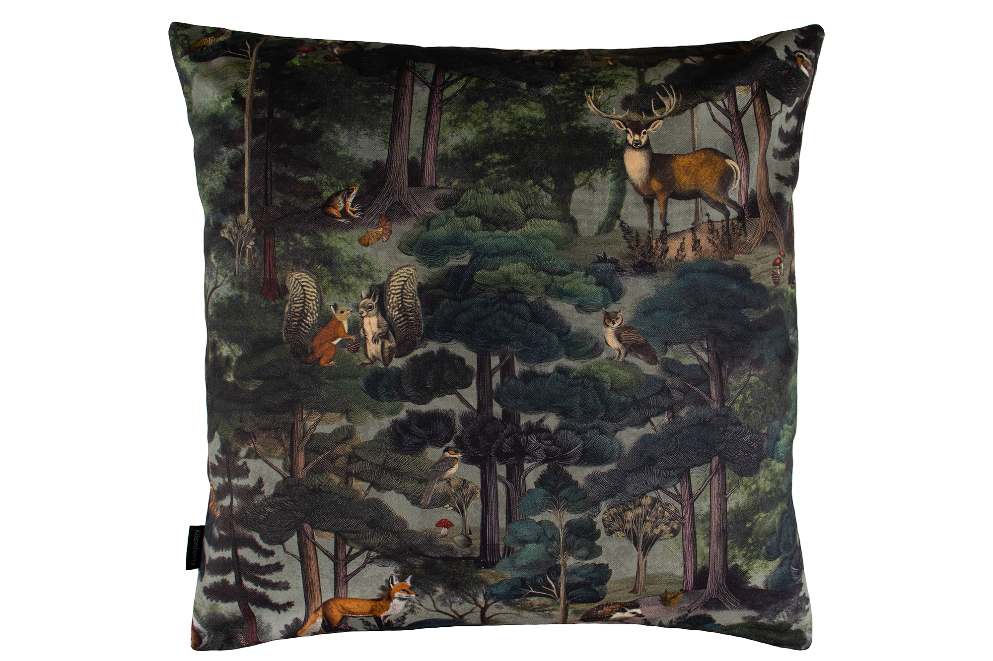 Näyttävä Sysimetsä koristetyyny 60x60cm. Olohuoneen sisustus saa upean ja kauniin yksityiskohdan isolla sohvatyynyllä. Irroitettava polyesterinen sisätyyny, päällinen on avattavissa vetoketjulla. Pesu 30 asteessa.