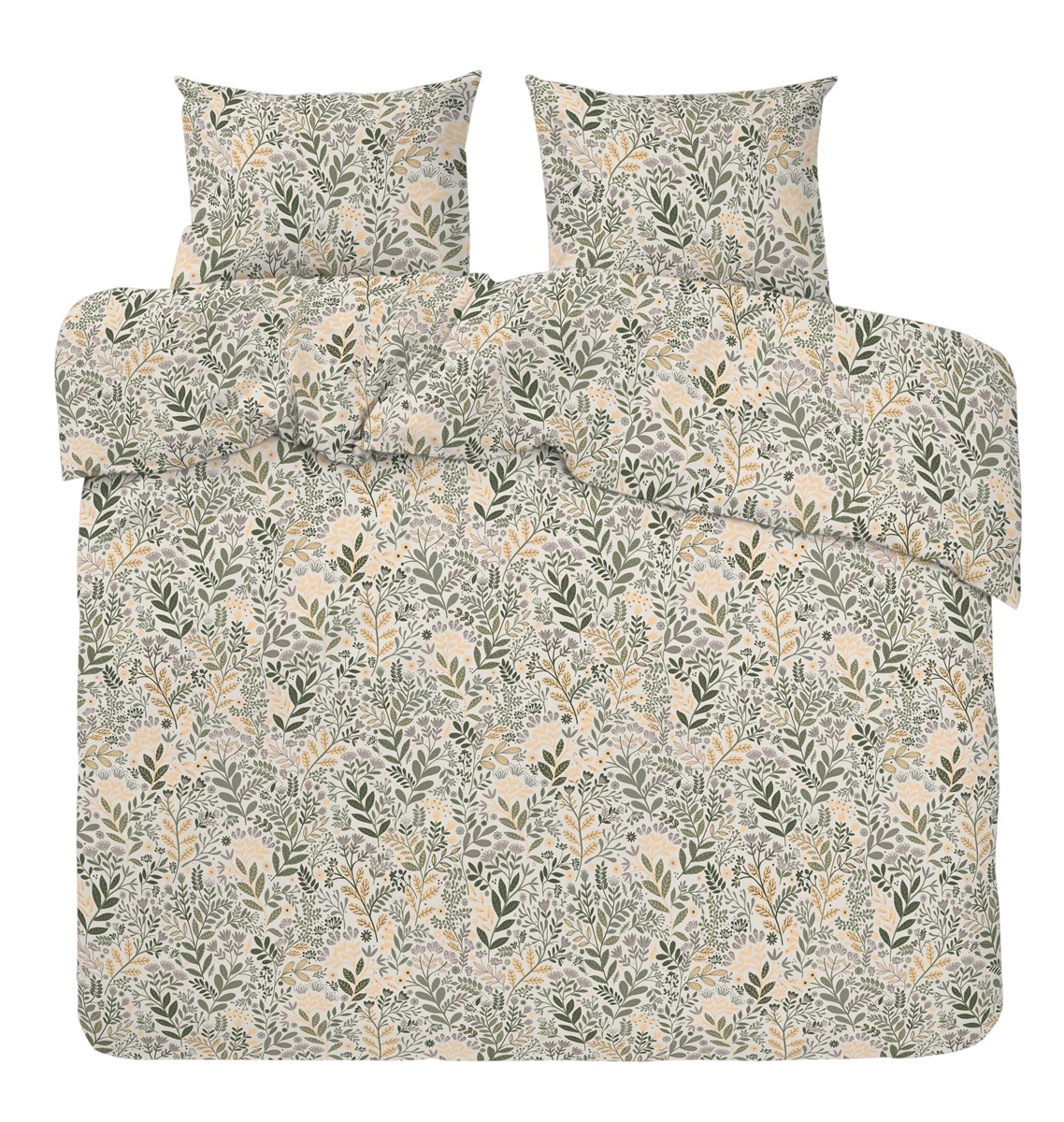 Puuvillainen parivuoteen pussilakanasetti Niitty 220x210cm. Pussilakanassa on kulmareiät ja aukko alareunassa. Pussilakanan voi pestä 60 asteessa. Setissä on kaksi kappaletta 50x60cm tyynyliinaa.